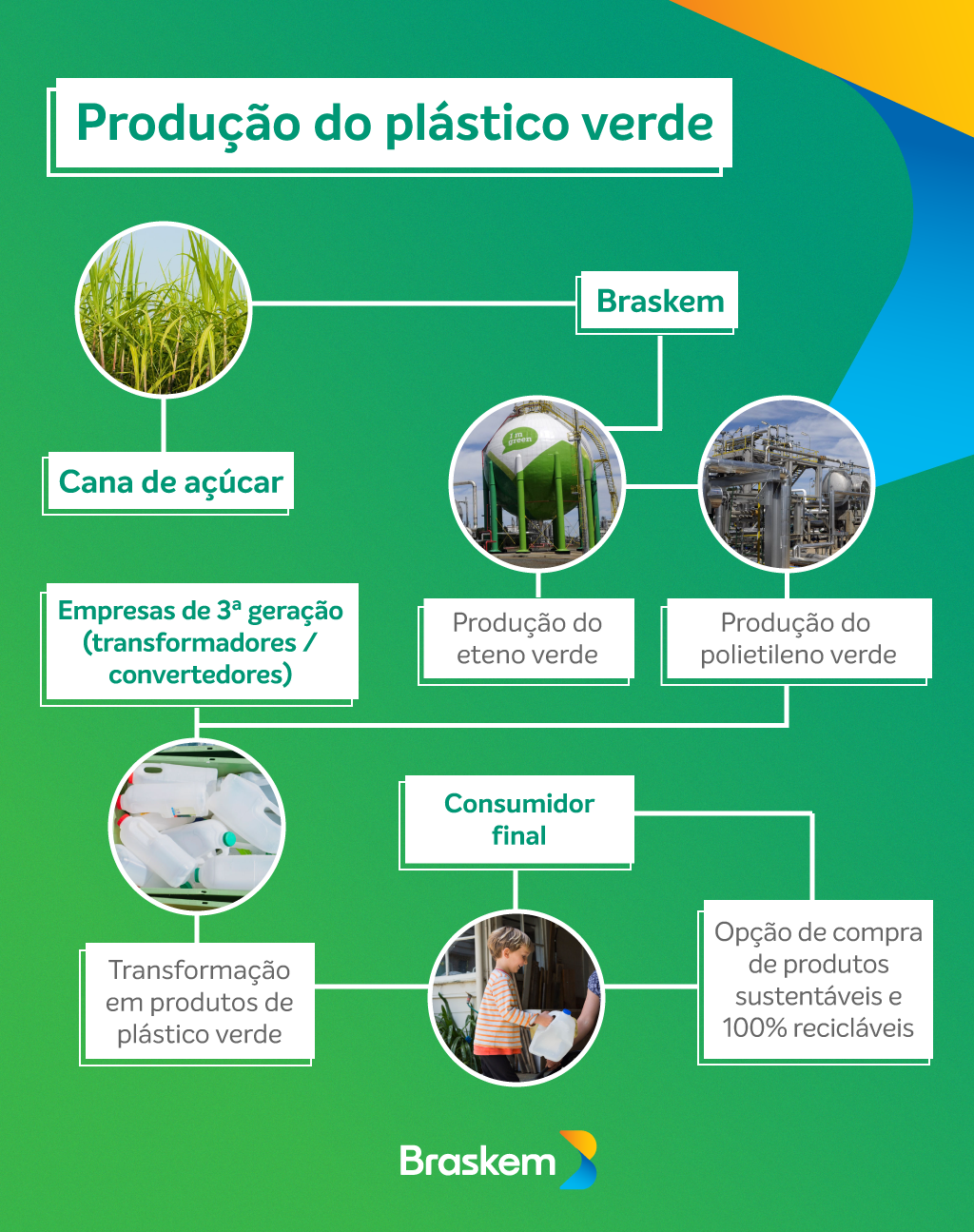 O etanol da cana-de-açúcar é transportado até a planta da Braskem geralmente por ferrovias. Ao chegar no destino, passa por um processo de desidratação, sendo transformado em eteno verde, o monômero (molécula) que alimenta as plantas de polimerização, onde o polietileno verde e o EVA verde são produzidos. O plástico de cana-de-açúcar segue, então, para empresas de terceira geração, chamados transformadores ou convertedores, que irão transformá-lo em produtos plásticos que chegam ao consumidor final, como as embalagens, calçados e utilidades domésticas, por exemplo.
